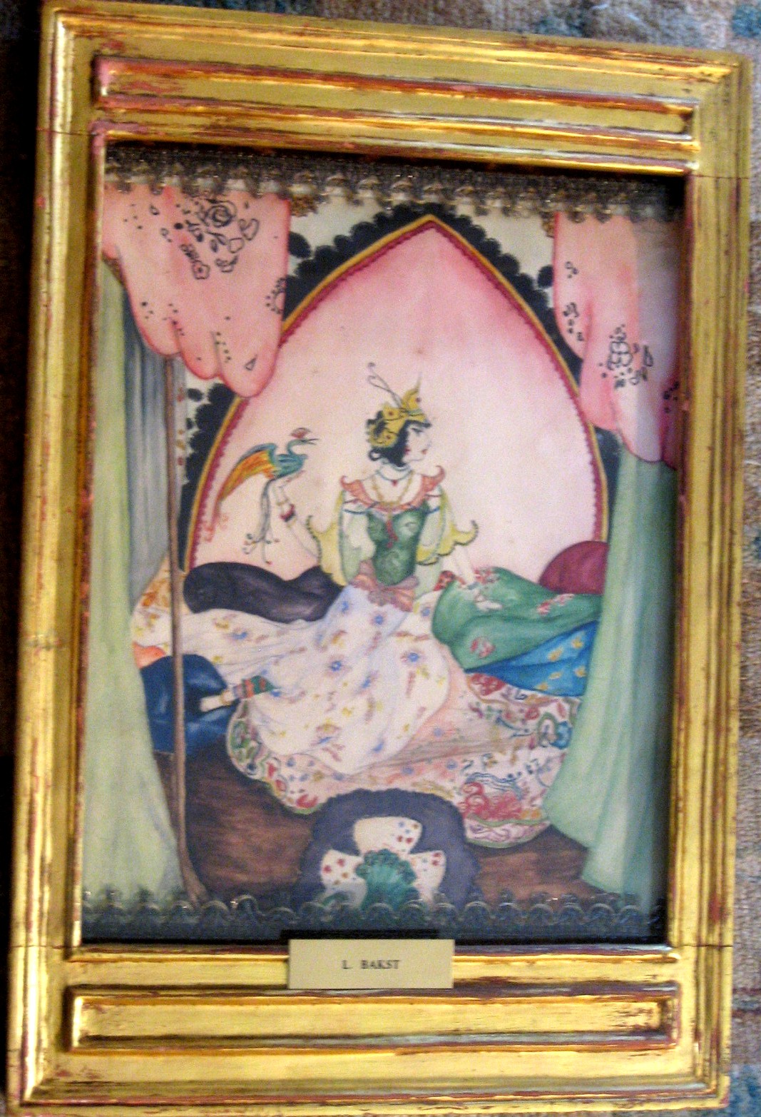 Japanese costume for Gertrude Vanderbilt-Whitney (1875-1942, founded the Whitney Museum). Watercolor on paper. Inscribed by Bakst “Gertrude Jappa(nese)” in pencil upper right, signed “Bakst” in red ink and inscribed “Leon Bakst” by other hand in pencil on the back, 11x8.5”[1913]. “In 1913 Gertrude Vanderbilt Whitney commissioned from Bakst an ensemble consisted of a flared tunic and hare trousers. She also commissioned a portrait of herself by Robert Henri in 1916 that is now in Whitney Museum, showing her reclining on a sofa like an odalisque.” [Orientalism in America, 1870-1930. Mint Museum of Art, Charlotte, N.C., 2001]. John Singer Sargent also executed Gertrude portrait in that costume in 1914 (now in Whitney Museum). Authenticity of the drawing confirmed by the curator of Whitney Museum Ms. Stephanie Schumann 09.20.2004. In American, beginning of 20th century, Arts & Crafts, hand carved and gilded cassetta style Foster Bros frame, label on verso.
