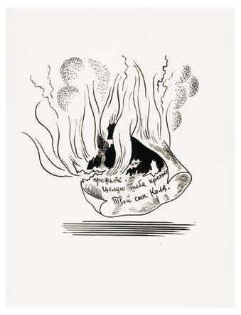 [With:] Illustration of burning manuscript. Ink on paper (190 x 155 mm). Framed.