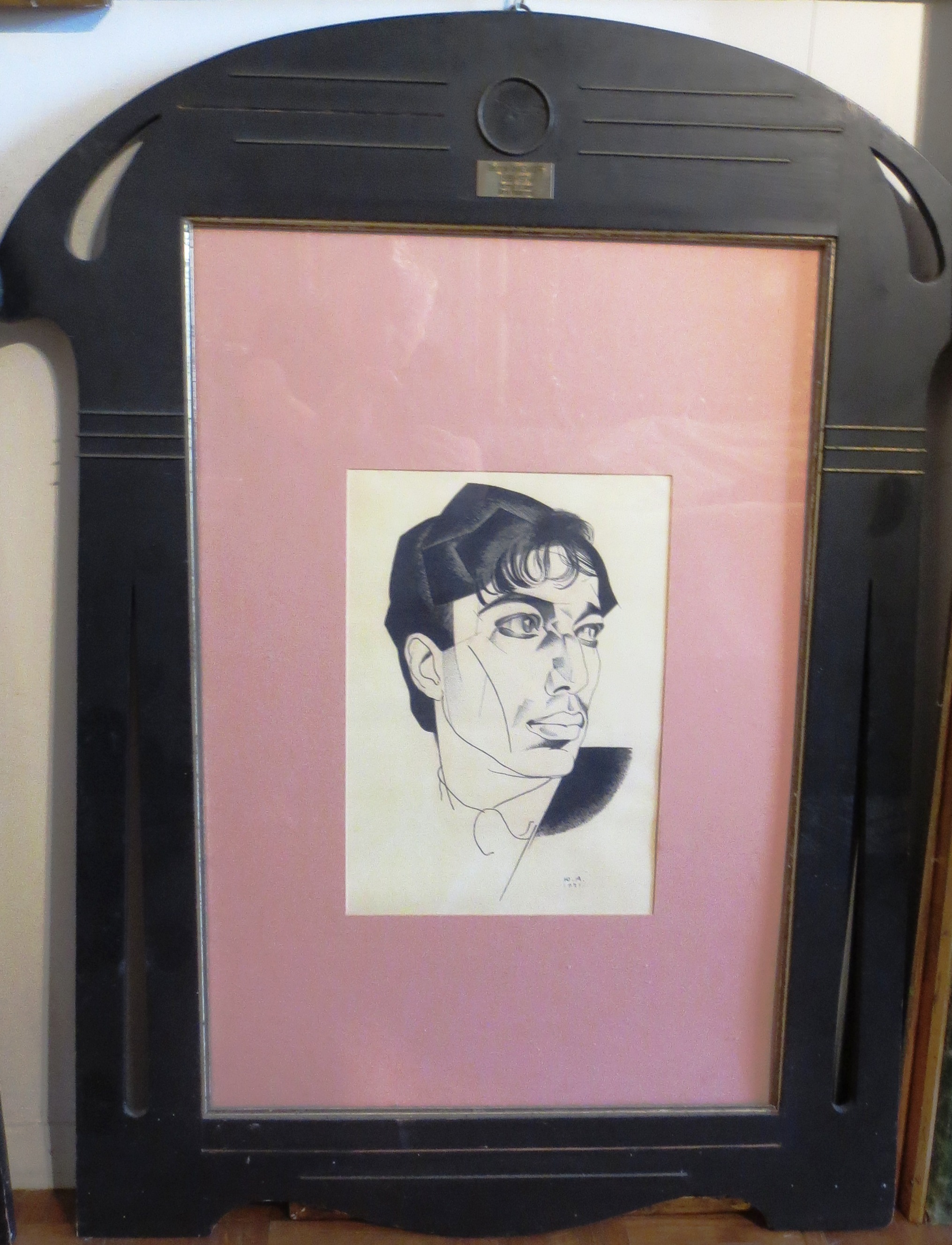 Portrait of poet Boris Pasternak. Signed with initials and dated 1921 lower right, Indian ink on paper. 17 x 11". Published in “Portrays”, text by E. Zamiatin, M. Kuzmin, M. Babenchikov. Petropolis, Peterburg,1922. p.66 and in “Vozrozhdenie” N102, 1960. Bibliography: “A Time to Gather… RUSSIANART From Foreign Private collections”, State Russian Museum, Saint-Petersburg, Palace Editions,2008, illustrated on p.25.. Exhibited: “Faces of Russia”, February 2007, West Palm Beach International Art Fair, USA (illustrated on page 28 of the catalog). In original European hand-carved ebonized frame art nouveau with brass decorations