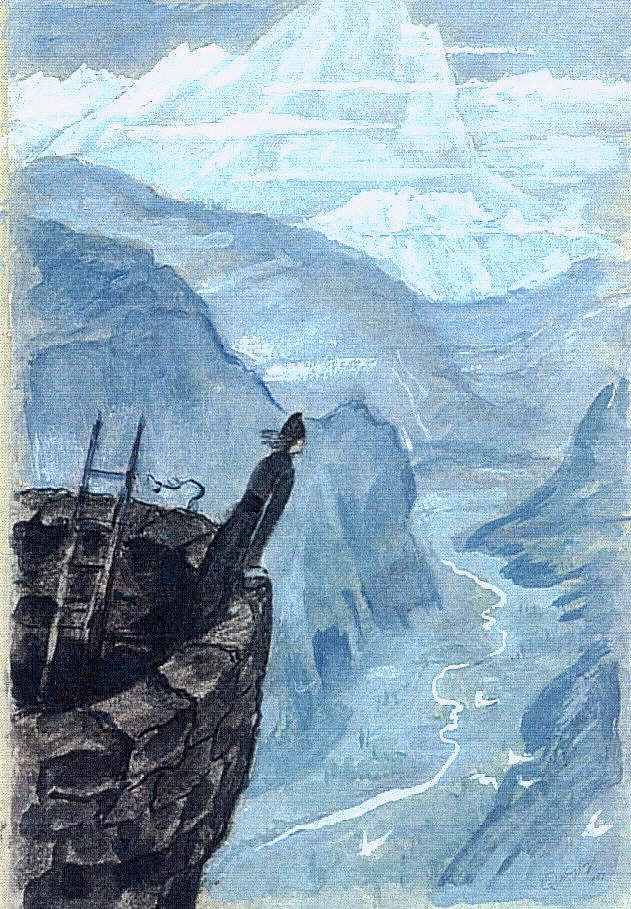 ”Grimasy goroda”. Gouache and ink on cardboard signed by monogram and dated 1908. 11 x 8". Reproduced in “Perezvony”N10, 1926. Another version in GTG, Moscow, reproduced in "Dobuzhinski Mstislav" by A. Gusarova. Moscow, Izobrazitelnoe Iskusstvo, 1982, p.76. Provenance: A. Raydon Gallery, N-Y. In original Spanish 17th Century carved and gilded frame with leaf sight, reverse leaf to the hollow, and demi-flower back edge