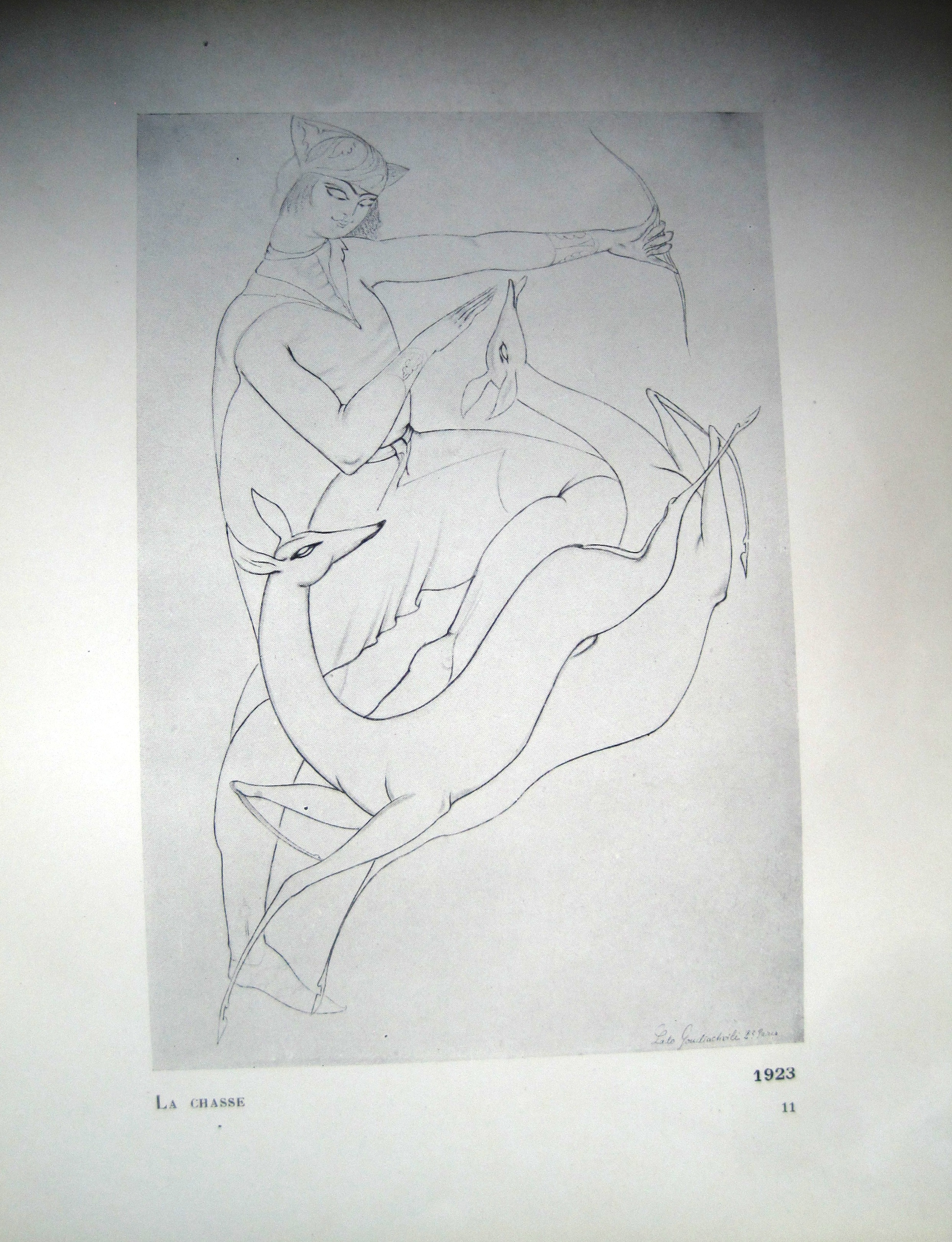 Une vierge à Montparnasse. Pencil on paper, signed, dated 1921 and inscribed Paris. 15 x 11". Exhibited: Galerie de la Licorne, Paris, 26.05.-09.06.1922 (#51 of the catalog) This drawing had been used as a draft for the painting “Sur la Terrasse” (illustrated in “GOUDIACHVILI Lado”, Text by Maurice Raynal, Paris, Au Sans Pareil, 1925). In original art nouveau frame with ormolu scene on perdella