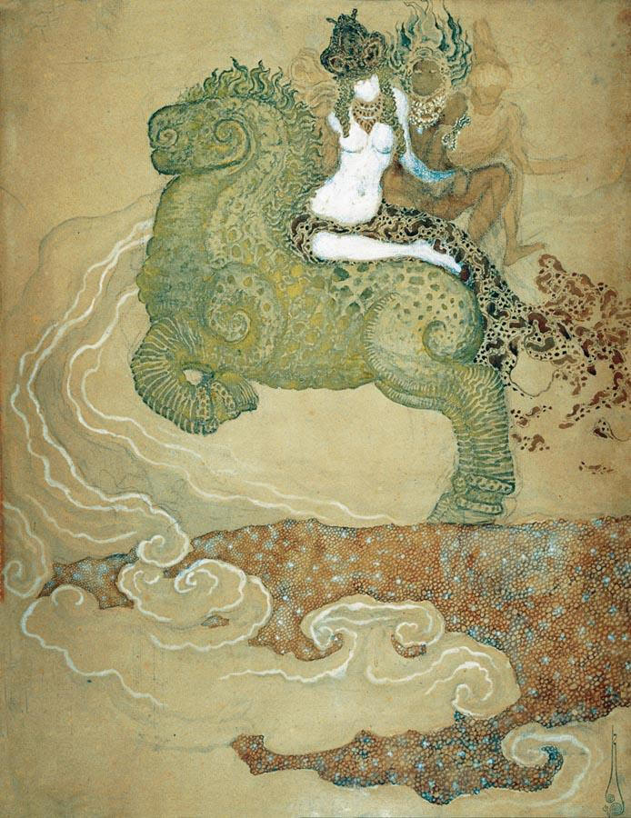 THREE WOMEN RIDING A MONSTER signed with artist's monogram l.r. and dated 1911, watercolor and gouache over pencil on paper heightened with chalk and gold paint, size: 63 by 48.5cm., 24¾ by 19in. EXHIBITED: Galerie Motte, Paris, 1964, Cat. No. 17 Illustrated in Калмаков Николай, текст Боулт и Балыбина, Искусство 21 век Москва 2008 p 32.