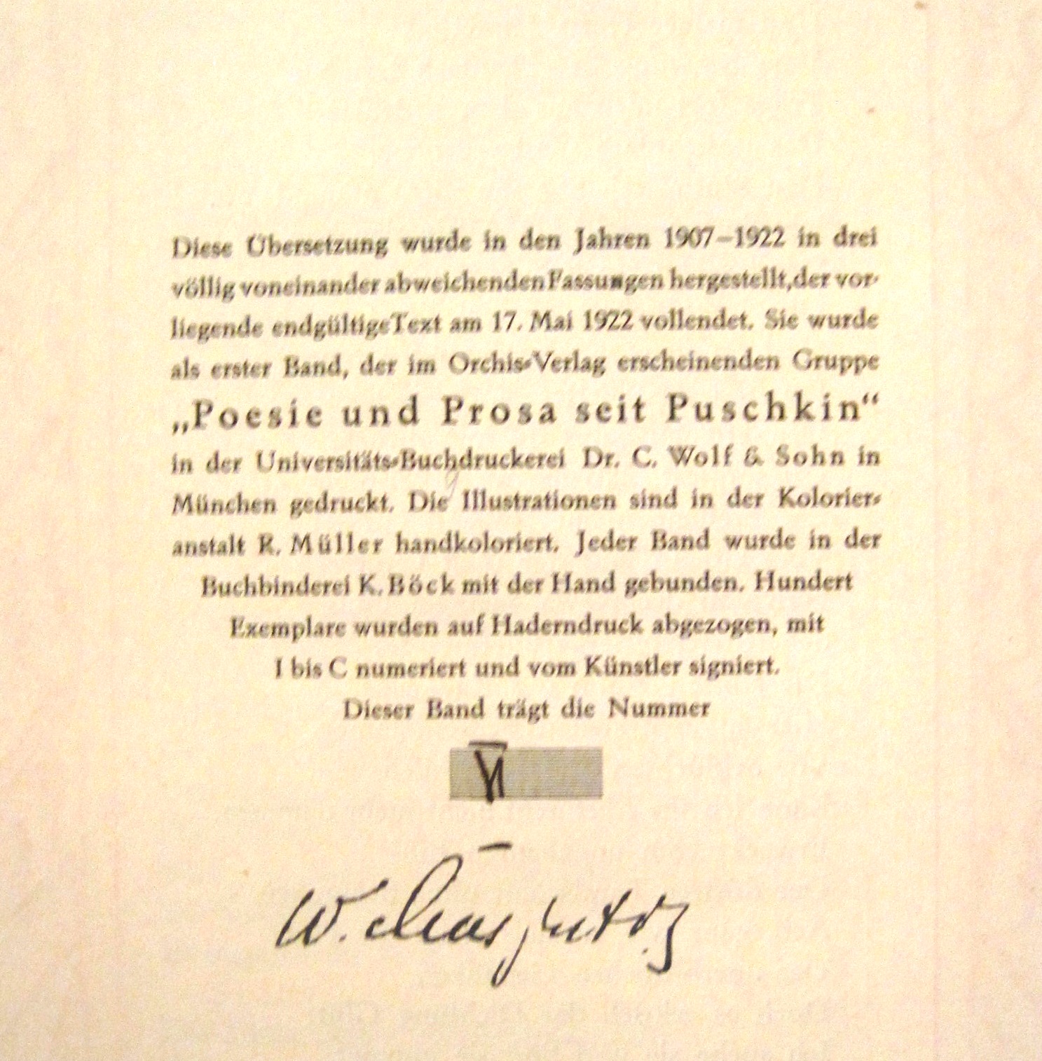 A [lexander] S [ergejewitsch] Pushkin. Ruslan and Ludmilla. A fantastic tale. Translated from Russian by John Guenther. Title drawings and illustrations of Vasily Masjutin. Munich, Orchis 1922. With nine pochoir illustrations and book decorations. Original half vellum binding with colored cover vignette. Copy VI of 100 Roman numbered the special edition on Hader pressure paper. - Signed by the artist in publisher's imprint and numbered. - Colored woodcuts by the artist. $3000.-
