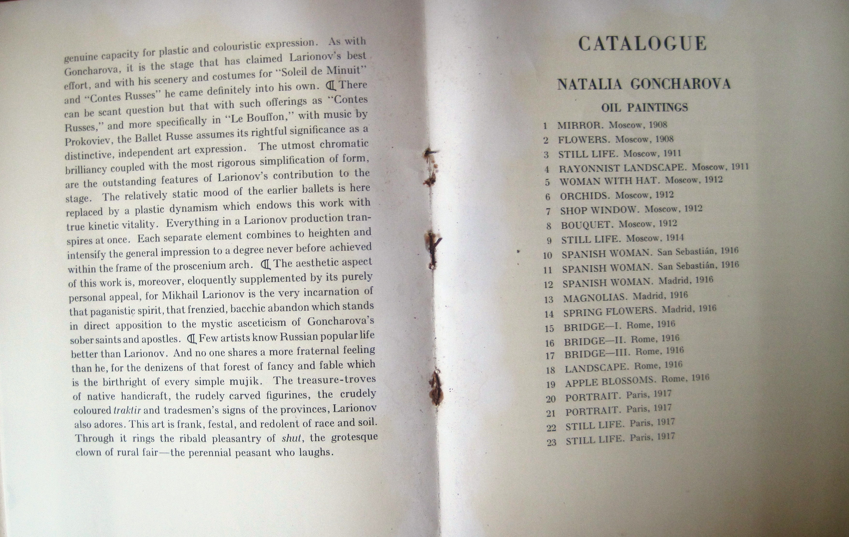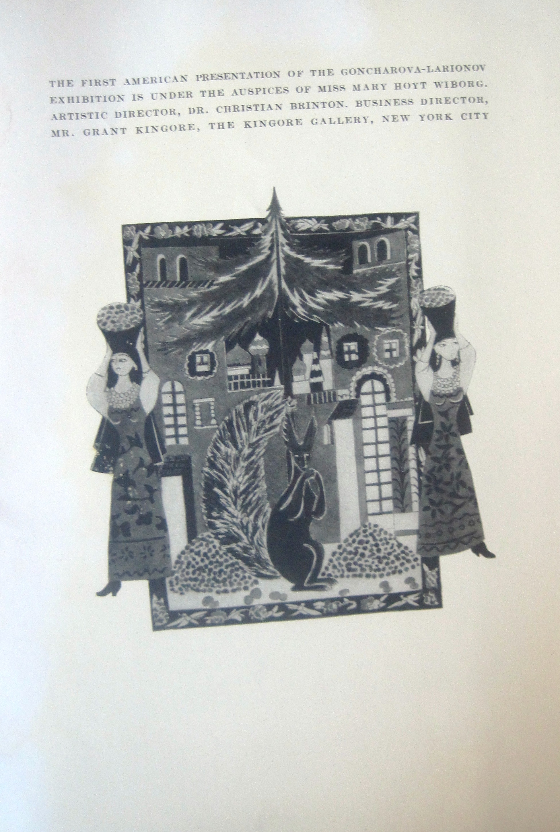 A very rare Art Catalog "The Goncharova-Larionov Exhibition" Introduction and Catalogue by Christian Brinton. Lithographic covers by N. Goncharova. The exhibition was held in 1922 at The Kingore Gallery New York City. The catalogue contains 16 pages. The 7" x 9-1/2" catalogue is in VG condition,