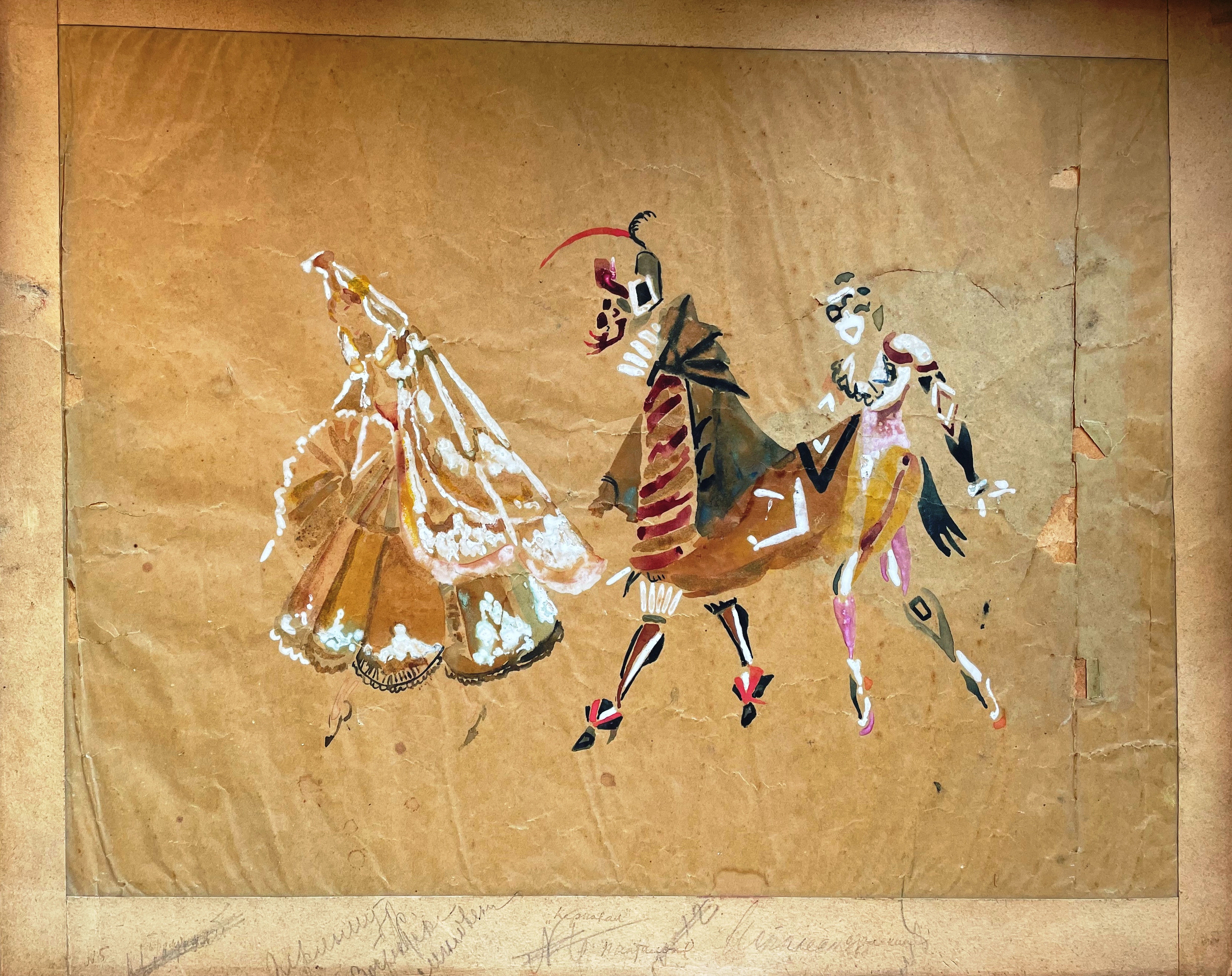3 projets de costumes pour "Princesse Brambilla") Dessin à la gouache sur papier calque H. 31 cm L. 40.5 cm Inscribed in pencil with a title "Carnival, Pantalone" below center and signed below right. Manques et déchirures Provenance : Collection Focillon-Baltrusaitis; DE BAECQUE et Associés 13 mai 2022 Paris lot205 La procession est à rapprocher d'une esquisse conservée au Musée du Théâtre d'Art de Moscou (N° inv. CP 295803) et deux des figures du dessin sont également à comparer avec deux autres esquisses du même musée (N° CP 238272/578 et KP 238272/566). Enfin la composition des trois comédiens s'illustre également dans le N° inv. CP 238272/597