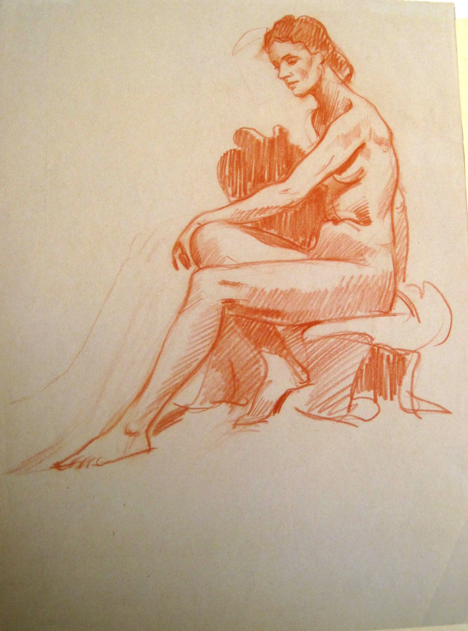 Folder with 7 (including 6 in red chalk and 1 double-sided) female and 1 male nude drawings on paper. Approximately 1930. 56 x 36 cm. Lose in a half-linen folder with cover plate "W. Masjutin" with his home address (at the time). 2 leaf verso with signature stamp. Sheet size of 40.5 x 30 till 56 x 35 cm $7000
